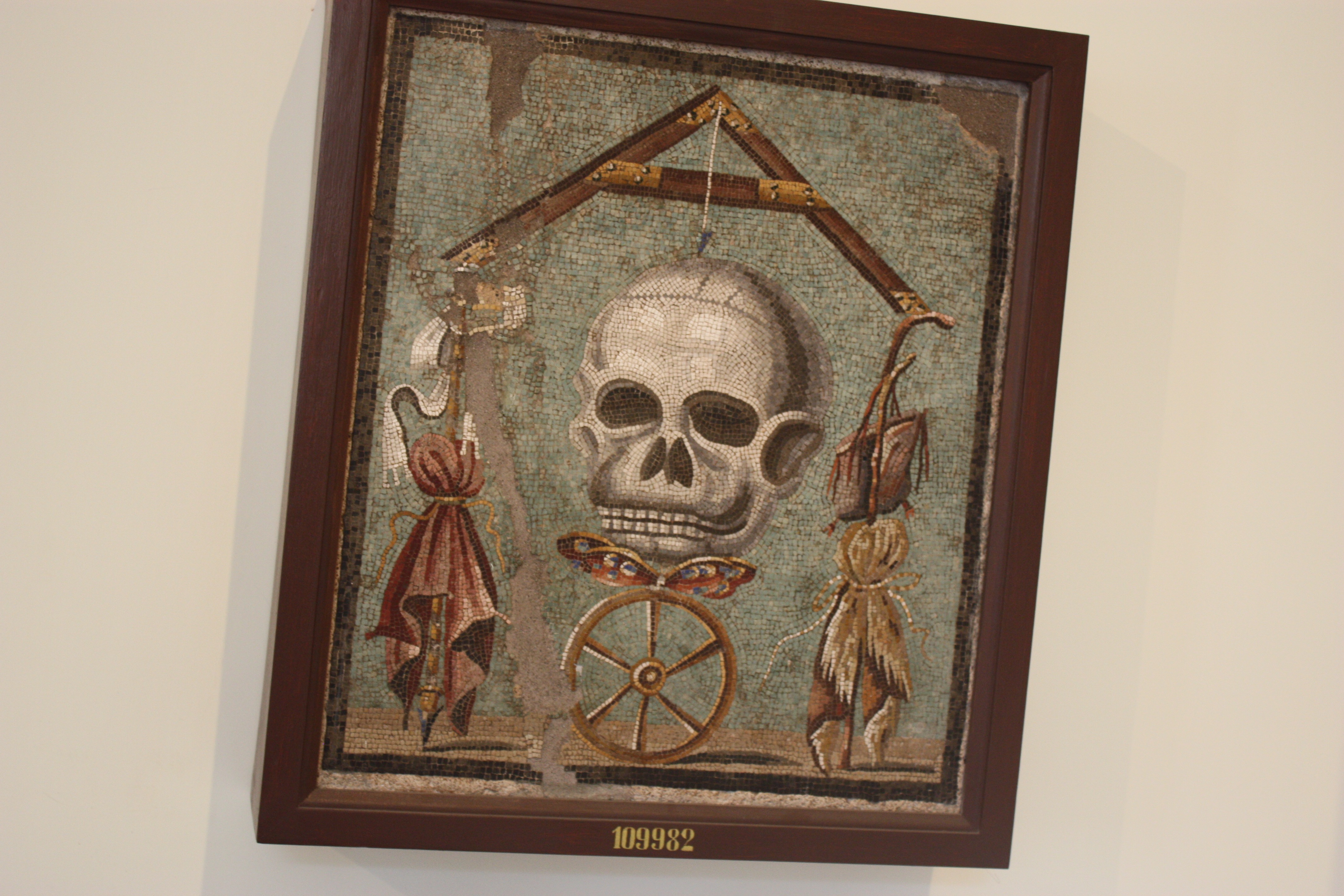 The above is a photograph that I took of a fantastic mosaic found in Pompeii (it now hangs in a museum in Naples).  Death (the skull) hangs below a libella (level) above the soul (the butterfly) and fortune (the wheel). The libella is balanced between wealth (on the left) and poverty (on the right).