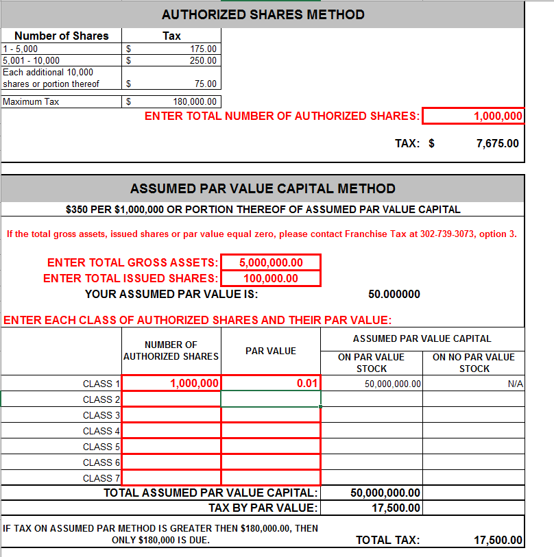 Delaware imposes a franchise tax on corporations incorporated in that state. The tax has nothing to do with the offer and sale of franchises. Rather, it is a tax "for the use of the State, by way of license". Del. Code tit. 8, § 501. There are two ways for determining the tax - the Authorized Shares method and the Assumed Par Value Method. The maximum tax per year under either method is $180,000. Del. Code tit. 8, § 503(c). If there isn't careful planning, the tax can be enormous for small corporations. For example, assume that a corporation has 1,000,000 authorized shares of one class of stock, par value $.01 per share; 100,000 shares issued and outstanding; and $5,000,000 in gross assets. According to the Delaware Secretary of State's franchise tax calculator, this corporation would owe $7,675 each and every year for the privilege of being a Delaware corporation! This tax is owed regardless of whether the corporation actually has Delaware income.