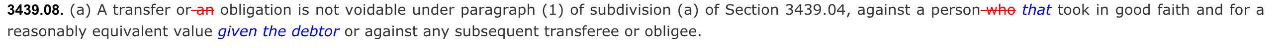 Granted, these are but minor changes, with the exception of the new requirement that value be "given the debtor". The Court of Appeal also anachronistically refers to "fraudulent conveyance" which hearkens back to the Uniform Fraudulent Conveyance Act. The UFTA referred to "fraudulent transfers" and the current UVTA refers to transactions that are "voidable".